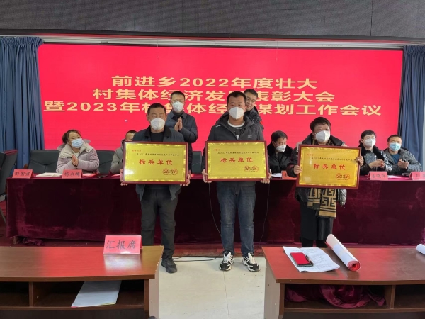 前进乡召开2022年度村集体经济发展表彰大会暨2023年村集体经济谋划工作会议,会议对集体经济发展好的3个村颁发标兵单位奖牌,对集体经济贡献突出的7名村书记及3名驻村第一书记颁发先进个人证书。随后各村对现有资产资源进行说明并谋划2023年村集体经济项目。会议要求:一是以持续发展为导向增强对村集体经济重视程度;二是以多元化发展为路径探索村级集体经济实现形式;三是以规范运营为抓手加强村级集体经济管理有效性;四是以奖惩为机制不断激发发展村集体经济的信心和决心。