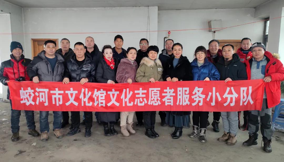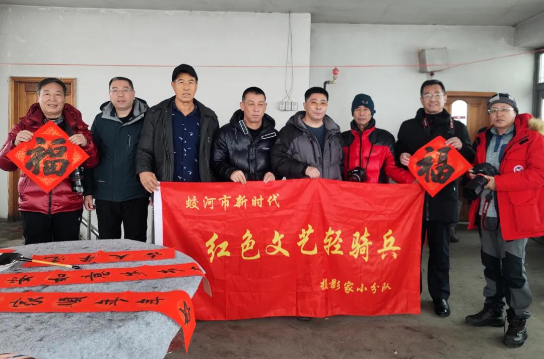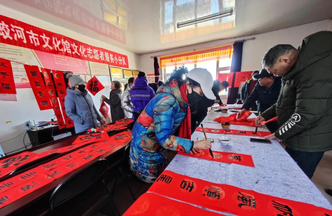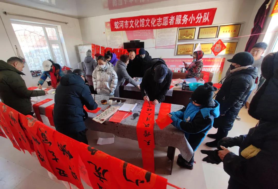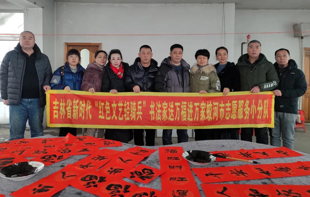 2022年 1月14日、15日两天,蛟河市“新时代红色文艺轻骑兵”文化志愿服务小分队分别到黄松甸镇黄松甸村、漂河镇四道沟村为群众送去了节日的祝福和问候。蛟河市文化志愿者为群众书写了500多副春联和福字,拍摄全家福打印照片80余张,并把春联、福字和照片赠送给当地群众。“三节”期间,开展写春联送福字,拍摄全家福进农家文化志愿服务活动,营造浓厚喜庆祥和的节日氛围,活跃城乡节日群众文化生活。